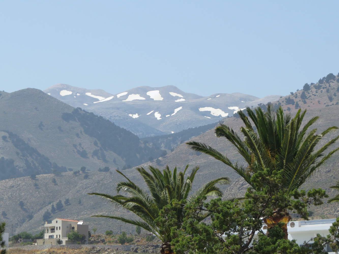 Das dürften die Lefka Ori, zu deutsch die weißen Berge, mit dem Pachnes als zweithöchstem oder vielleicht sogar höchstem Berg (2.454m) sein. Zur Erinnerung: Die Zugspitze ist 2962m hoch, also nur 500m höher.
