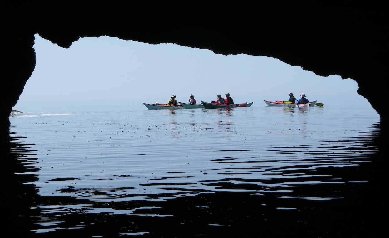 Das Fotos sieht aus, als sei es mit einem Blitzlicht aufgenommen worden, aber es war nur so, dass es in der Höhle sehr dunkel war, jedenfalls im Vergleich zum hellen Sonnenschein draußen, und die Kajaks sehr gut reflektierten. Der Blick nach draußen sah so aus: