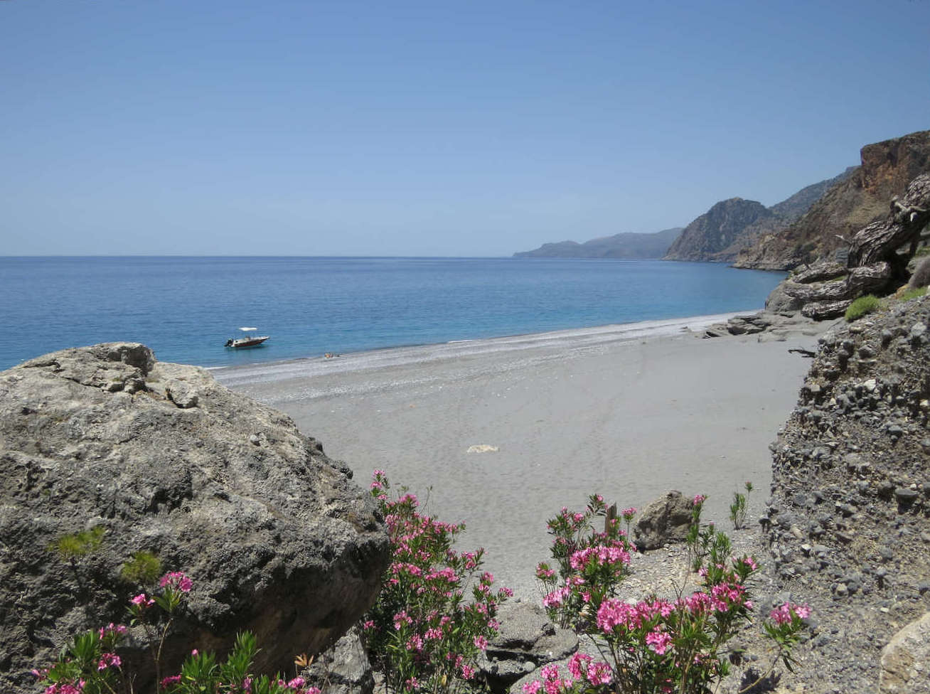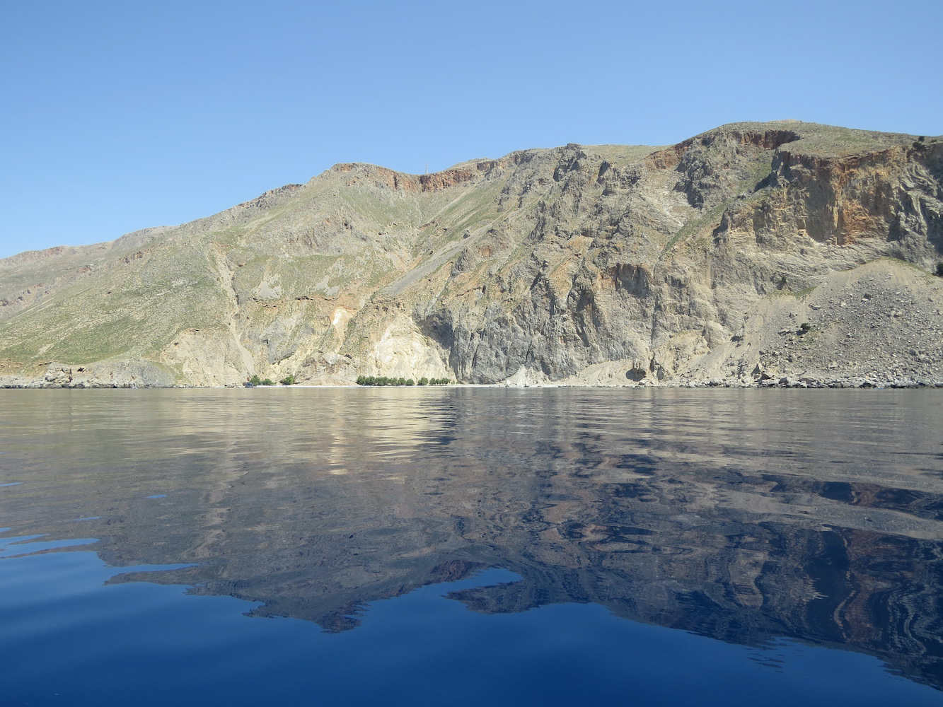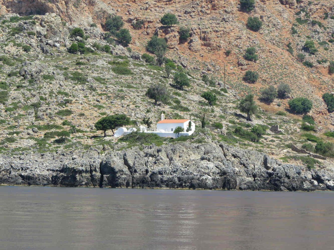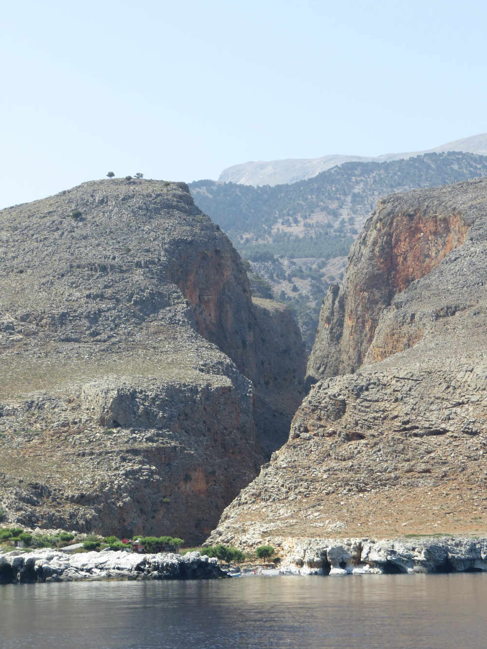 Weiter entlang der Küste kommt zunächst Loutro (s.u.) und dann der Ausgang der Aradena-Schlucht. Jetzt wird auch klar, warum ein Boot hier das geeignete Verkehrsmittel ist. Die westliche Südküste Kretas ist nicht nur sehr gebirgig, sondern auch von vielen Schluchten durchschnitten. Manche Orte haben hier gar keine Straßenanbindung.