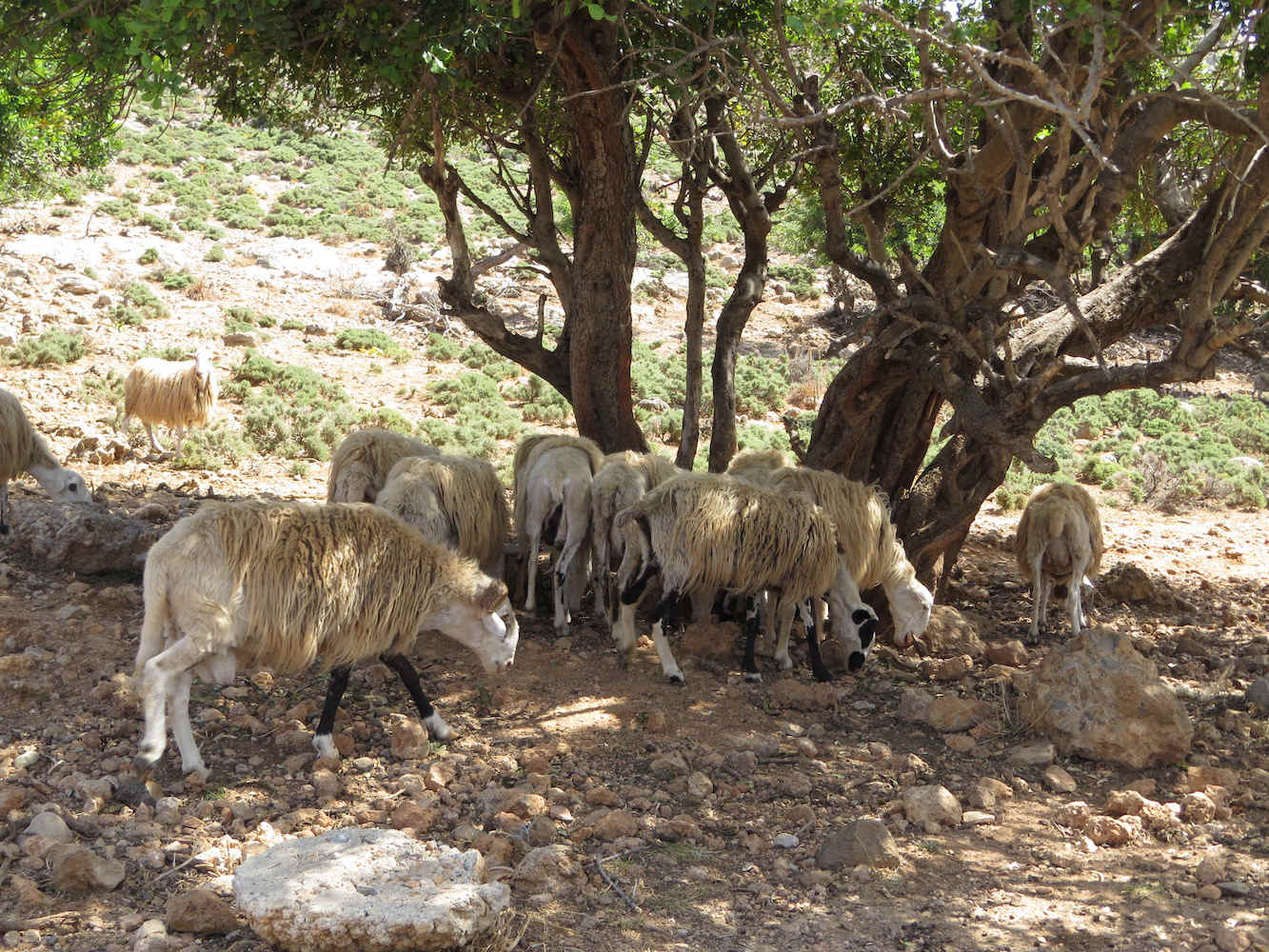 Wir sind dann weiter nach Osten auf der Suche nach einem neuen Strand gefahren. Nach ein paar Irrfahrten, auch vorbei an dieser Gruppe Schafe (oder sind es Ziegen?), irgendwo im Nirgendwo (zwischen Argoules und Rodakino) haben wir es aber geschafft. Ein Teil der Irrfahrten war vielleicht auf einem richtigen Weg, der aber nur mit Geländewagen befahrbar schien, so dass wir weiter nach einem geeigneteren Weg gesucht haben.