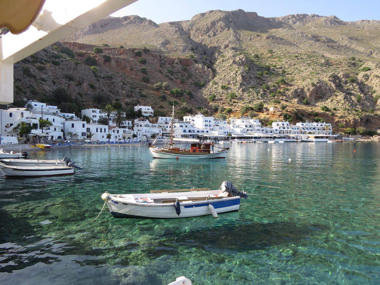 Zum Nachmittag sind wir nach Chora Sfakion zurückgekehrt und von dort mit dem Wassertaxi zum Sweat Water Beach, vorbei an einer von Fels umschlossenen Bucht in der Nähe des Ilingas Beaches.