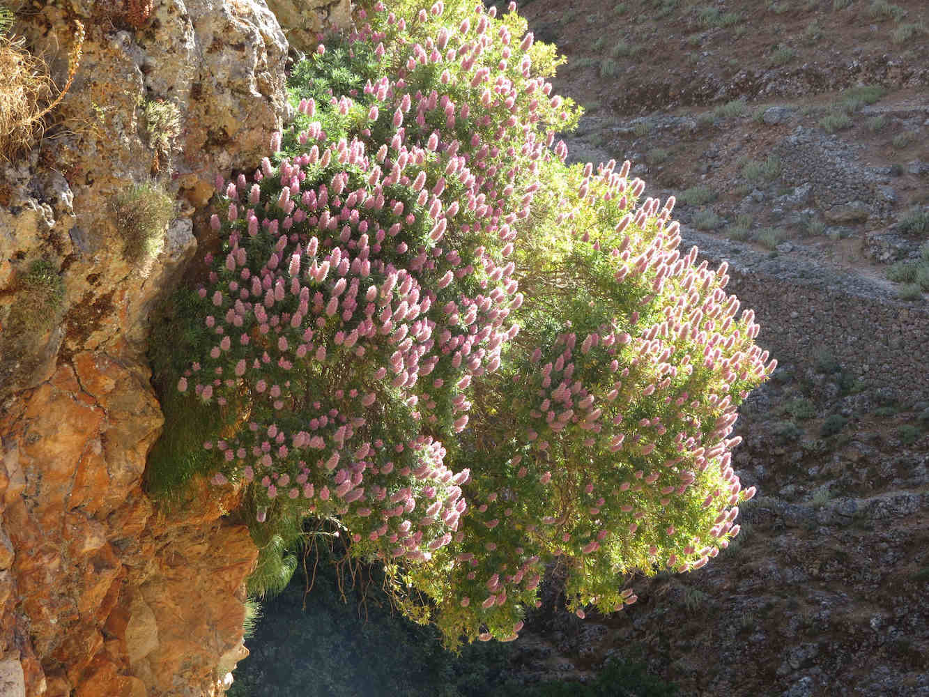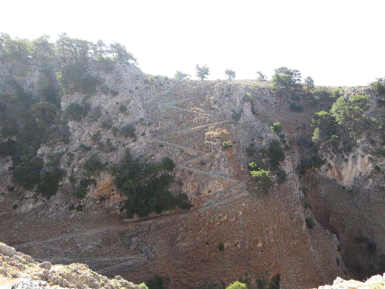 Aber der Abstieg war ganz angenehm, vorbei an diesem überhängendem Busch und mit Blick auf den alternativen Abstieg auf der anderen Seite. Vielleicht musste man früher auch dort herunter und auf dieser Seite wieder hoch, bevor die Brücke da war.