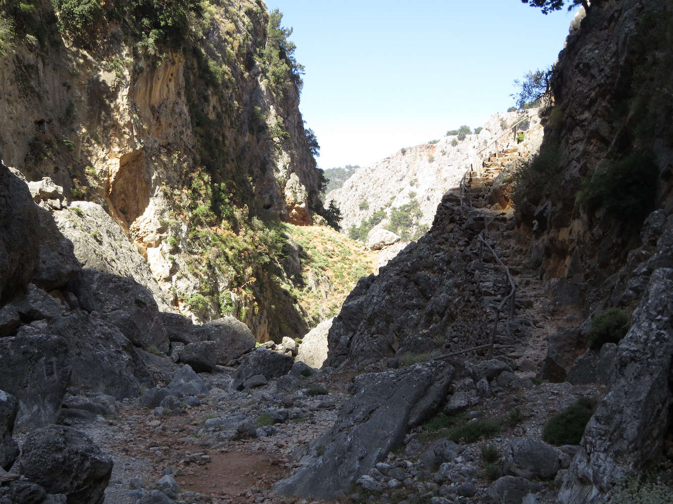 Jedenfalls war die Wanderung sehr beeindruckend in der Aradena-Schlucht, aber nichts für Wanderer mit schlechtem Schuhwerk und Höhenangst, oder frisch operiertem Knie. Aber wir konnten oder wollten nicht mehr zurück und haben das durchgezogen. Von der Umgehung für die schwierigste Stelle haben wir erst später erfahren, ich glaube, von anderen Wanderern, mit denen wir uns noch in der Schlucht unterhalten haben. Dafür haben wir nun die Erfahrung gemacht und im Nachhinein war es doch sehr interessant.